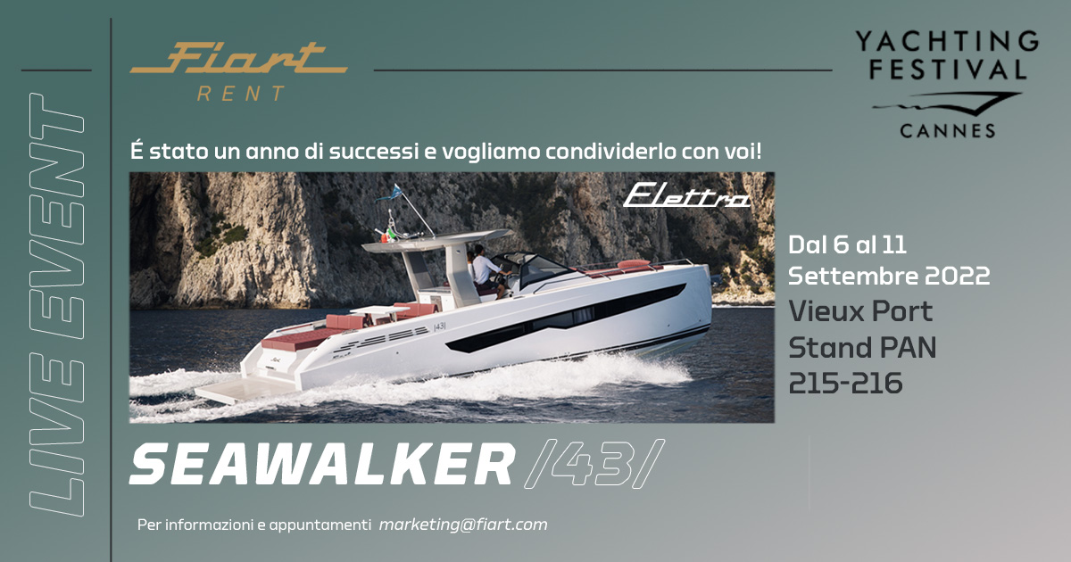 CANNES YACHTING FESTIVAL 2022 Dal 6 al 11 Settembre, stand PAN 215-216Ti aspettiamo per farti conoscere la nostra flotta #FiartRent e per salire a bordo del #Seawalker43 #Elettra.Per il tuo tempo libero,