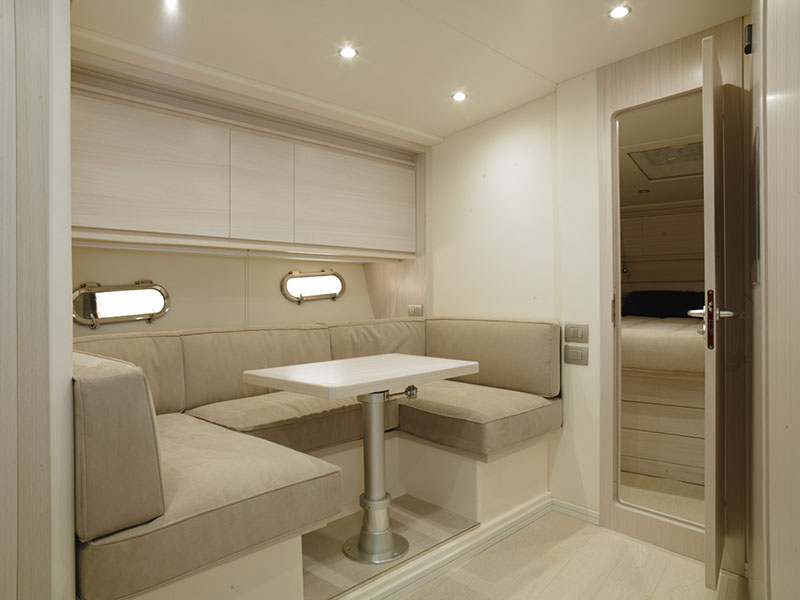 La dinette è allestita con parquet in rovere sbiancato, il pozzetto, trasformabile in prendisole o zona pranzo, è in teak.